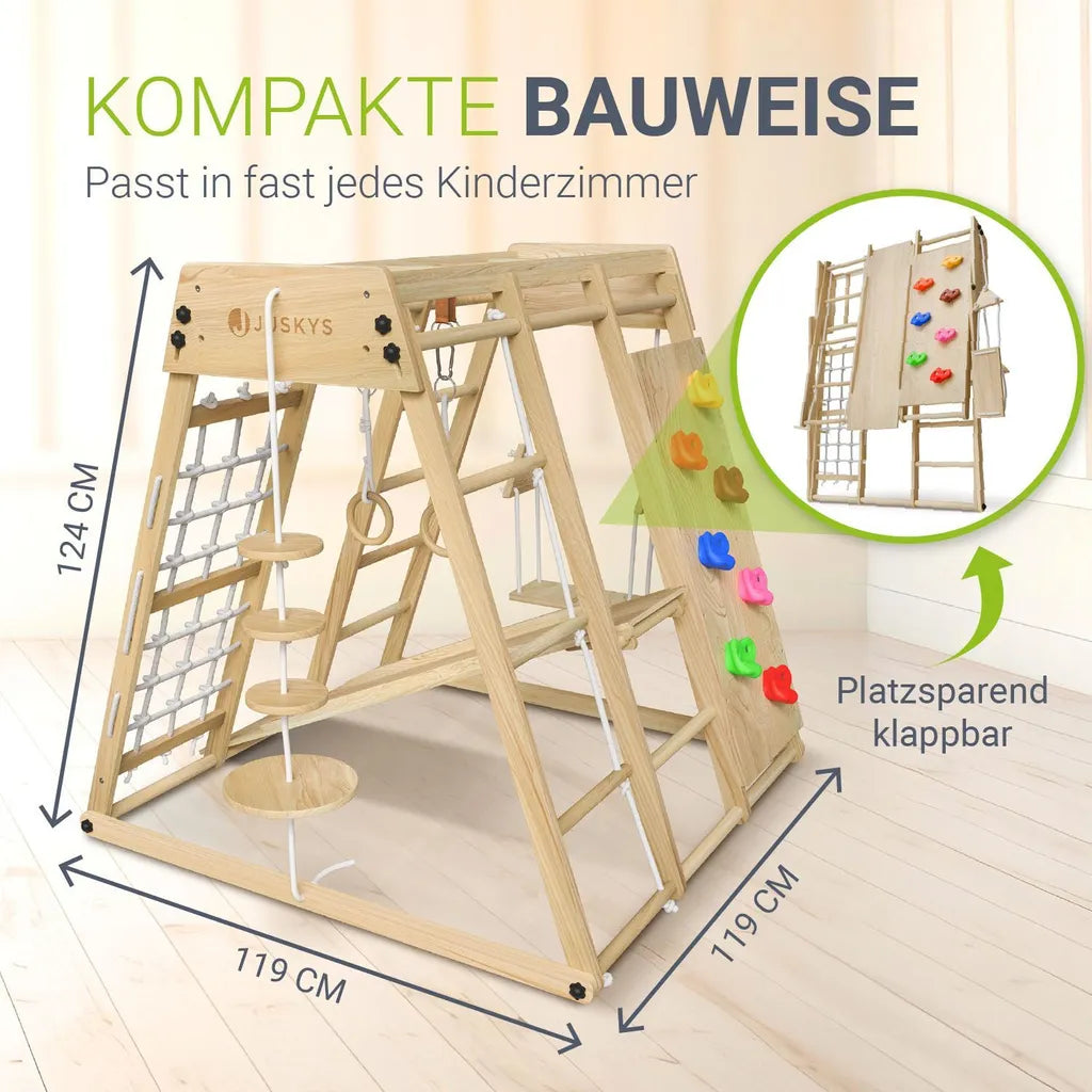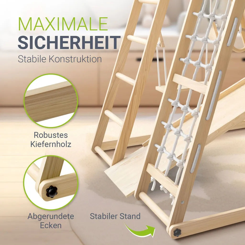 Entdecken Sie das vielseitige Maxi Klettergerüst für Kinder mit Rutsche, Kletterwand und Zubehör. Das robuste Spielgerüst aus Holz verwandelt jedes Kinderzimmer in einen beliebten Indoor Spielplatz. Hier können die Kleinen ihren Bewegungsdrang auf vielfältige Weise ausleben. Ob Klettern, Rutschen oder Schaukeln – das Klettergerüst bietet stundenlangen Spielspaß und fördert gleichzeitig die motorischen Fähigkeiten. Aus Kiefernholz gefertigt, bietet es Sicherheit und Stabilität für kleine Abenteurer, die sich austoben und neue Herausforderungen meistern wollen. Dank der Klappfunktion ist wieder schnell Platz im Zimmer geschaffen.
