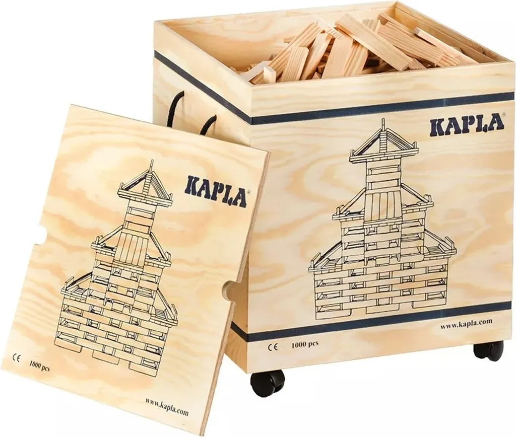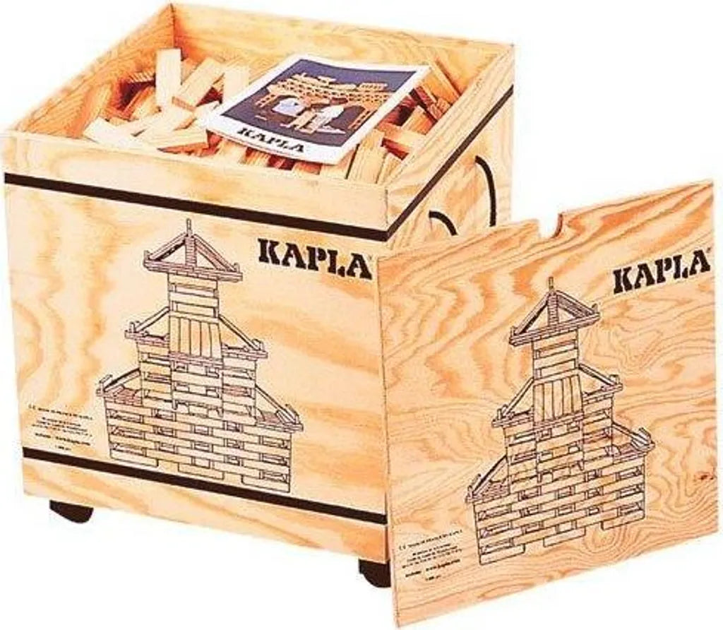 In dieser hübschen, bedruckten Holzkiste befinden sich 1000 KAPLA-Plättchen aus Pinienholz sowie 2 Anleitungshefte.