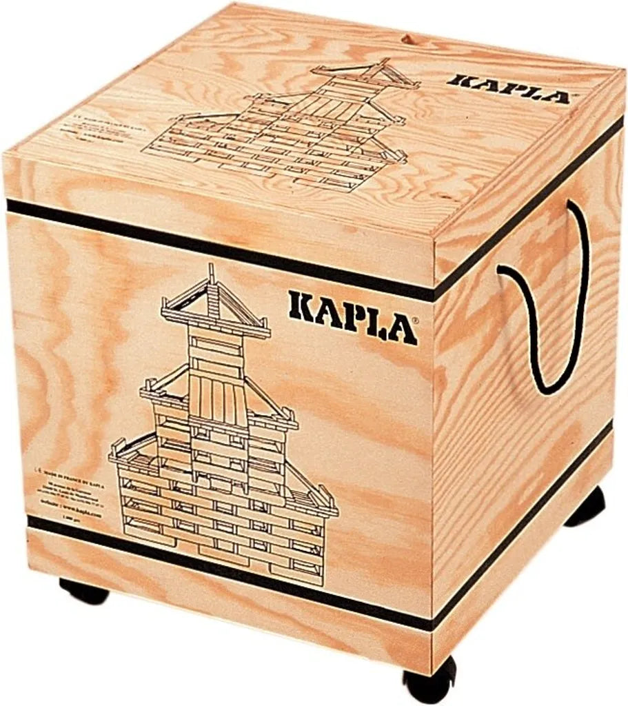 Mit der KAPLA® 1000er Box sind dem Bau- und Konstruktionsspaß keine Grenzen mehr gesetzt. Durch die Rollen unter der Holzkiste und die seitlichen Kordeln lässt sich diese tolle KAPLA®100er Box auch für Kleinere leicht bewegen.