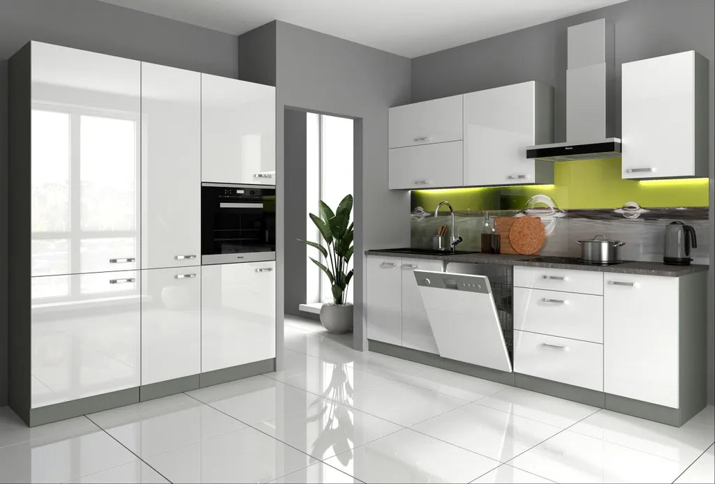 Diese praktischen Küchenzeilen im modernen Hochglanz weiß + grau matt Design sind ein wahres Kombinationswunder. Sie sind ein echtes Stauraum-Wunder, in dem alle Ihre Küchenutensilien Platz finden. Auch ein Einbaukühlschrank (Nische 122 cm) kann in die Küche Bianca I integriert werden. Das edle Design und die gute Verarbeitung tun ein Übriges, um aus Ihrer Küche eine Wohlfühloase zu machen.