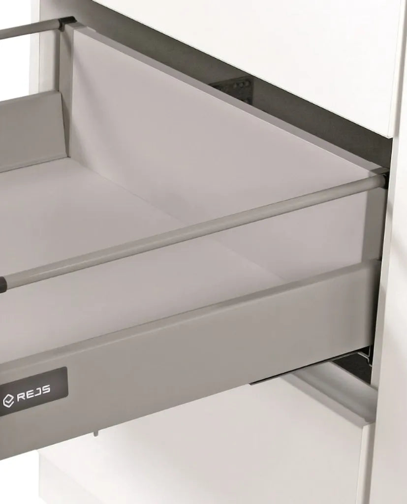 Schubkästen des 60 cm Schrankes bestehen aus hochwertigen Metallboxen inkl. Vollauzug und Softclose.
