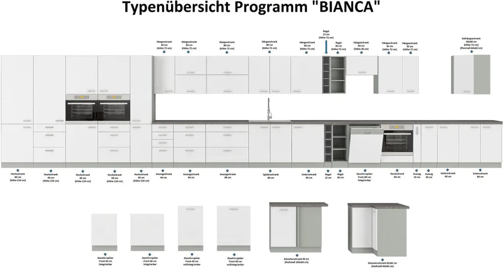 Sie können diese Küche mit unserem Einzelschrankprogramm Bianca beliebig erweitern.