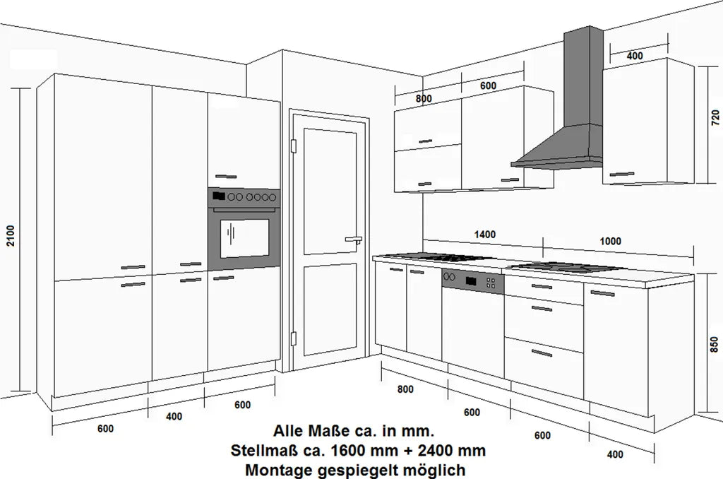 Breite 240 + 160 cm; Tiefe 60 cm; Arbeitshöhe ca. 85 cm